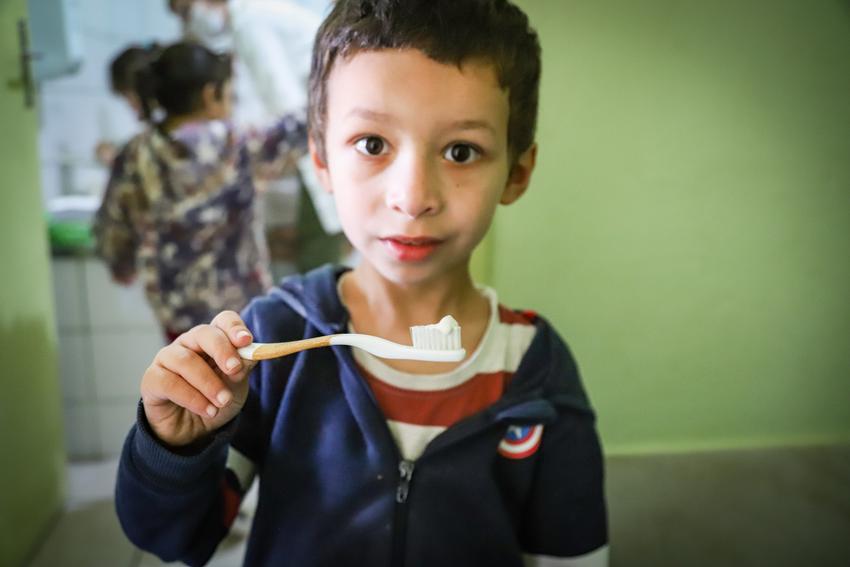 Porto Alegre, RS, 01/09/2025 A equipe de saúde bucal da unidade de saúde Assis Brasil, que atende usuários da unidade de saúde Jenor Jarros, junto com os agentes comunitários de saúde (ACS) desta última, em visita as crianças da Escola Conveniada de Educação Infantil (ECEI) Dutra Jardim, bairro Rubem Berta. A escola faz parte do território atendido pela US Jenor Jarros. Na ocasião a equipe fez atividades com músicas e materiais lúdicos em forma de escova de dentes, fio dental e a "vilã" cárie para falar sobre cuidados com a saúde bucal do pequenos de forma divertida. Além disso foi realizada oficina prática de escovação de dentes e revisão simples, feita pela dentista presente, para detectar se alguma das crianças precisavam ir até a US para revisões mais completas ou mesmo algum tratamento. A atividade faz parte das atividade rotineiras do Programa de Saúde na Escola (PSE). Foto: Cristine Rochol/PMPA