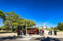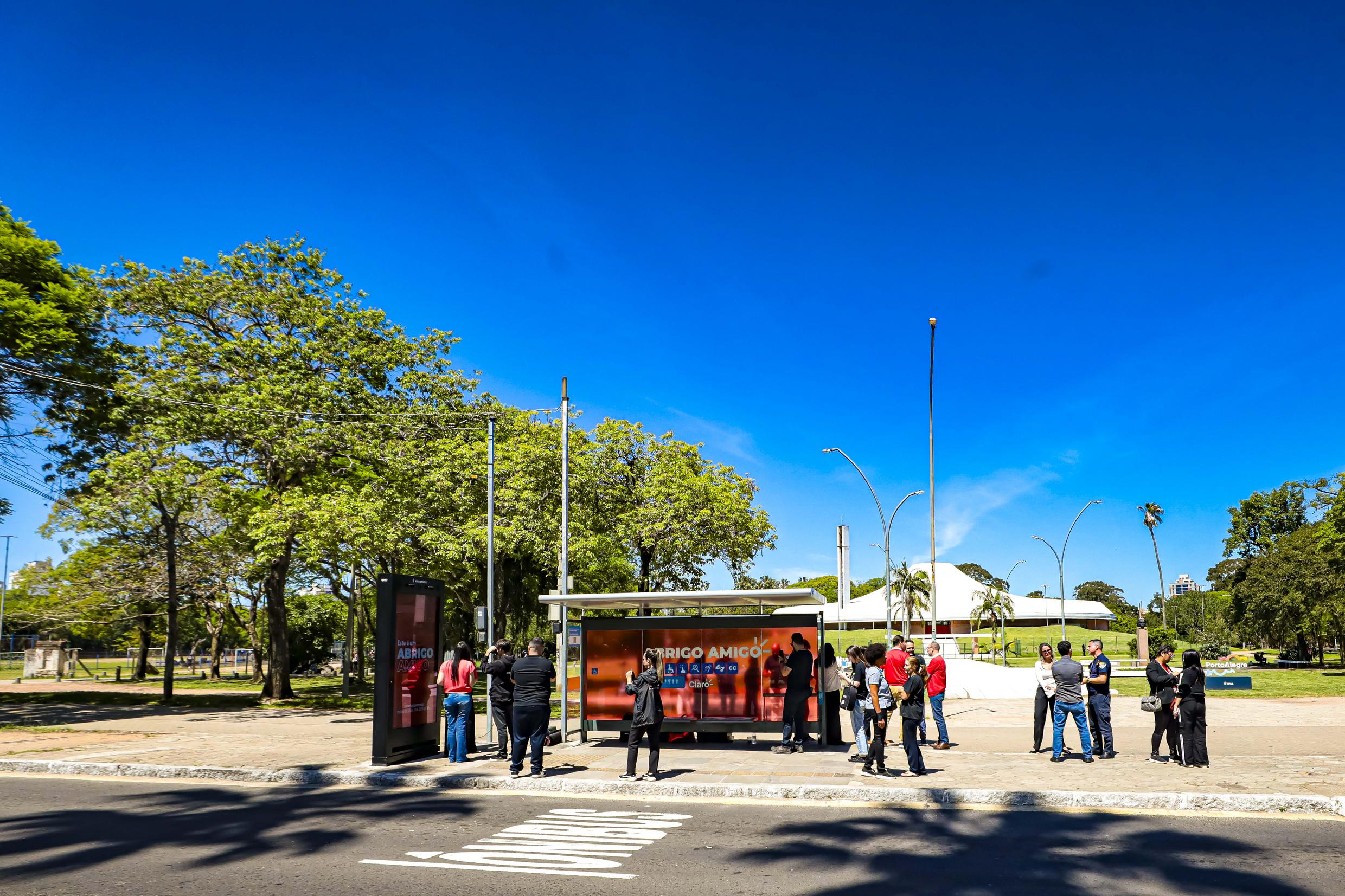 Porto Alegre, RS, Brasil, 22/10/2025: A Prefeitura de Porto Alegre, por meio da Secretaria de Mobilidade Urbana (SMMU), com apoio da Eletromidia e Claro, realizou nesta quarta-feira, 22, às 11h, a vistoria do primeiro ponto do abrigo amigo da cidade. O projeto transforma pontos de ônibus em locais de acolhimento, com possibilidade de acionamento de uma central de atendimento por vídeo. O primeiro ponto foi instalado na avenida Osvaldo Aranha, 909, bairro Bom Fim. No local, foi apresentado o funcionamento do sistema, além do impacto e os próximos passos da iniciativa na capital gaúcha. Foto: Alex Rocha/PMPA