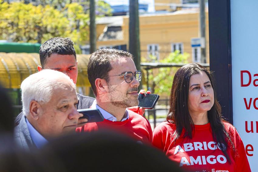 Porto Alegre, RS, Brasil, 22/10/2025: A Prefeitura de Porto Alegre, por meio da Secretaria de Mobilidade Urbana (SMMU), com apoio da Eletromidia e Claro, realizou nesta quarta-feira, 22, às 11h, a vistoria do primeiro ponto do abrigo amigo da cidade. O projeto transforma pontos de ônibus em locais de acolhimento, com possibilidade de acionamento de uma central de atendimento por vídeo. O primeiro ponto foi instalado na avenida Osvaldo Aranha, 909, bairro Bom Fim. No local, foi apresentado o funcionamento do sistema, além do impacto e os próximos passos da iniciativa na capital gaúcha. Foto: Alex Rocha/PMPA