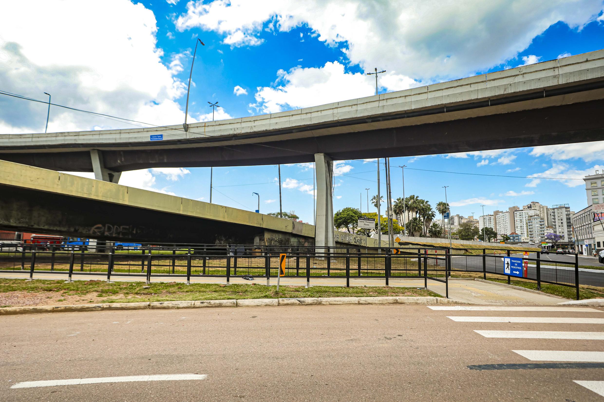 Porto Alegre, RS, Brasil, 22/9/2025: A Secretaria Municipal de Obras e Infraestrutura (Smoi) começou a instalação das contenções laterais da parte elevada do corredor humanitário, trecho que liga a avenida Castello Branco à Elevada da Conceição. Chamadas de barreiras New Jersey, as estruturas serão fixadas ao longo dos 400 metros de extensão do corredor. As barreiras são de concreto e servem para sinalizar o fluxo de veículos e proteger a via, além de impedir a travessia irregular de pedestres. Foto: Alex Rocha/PMPA