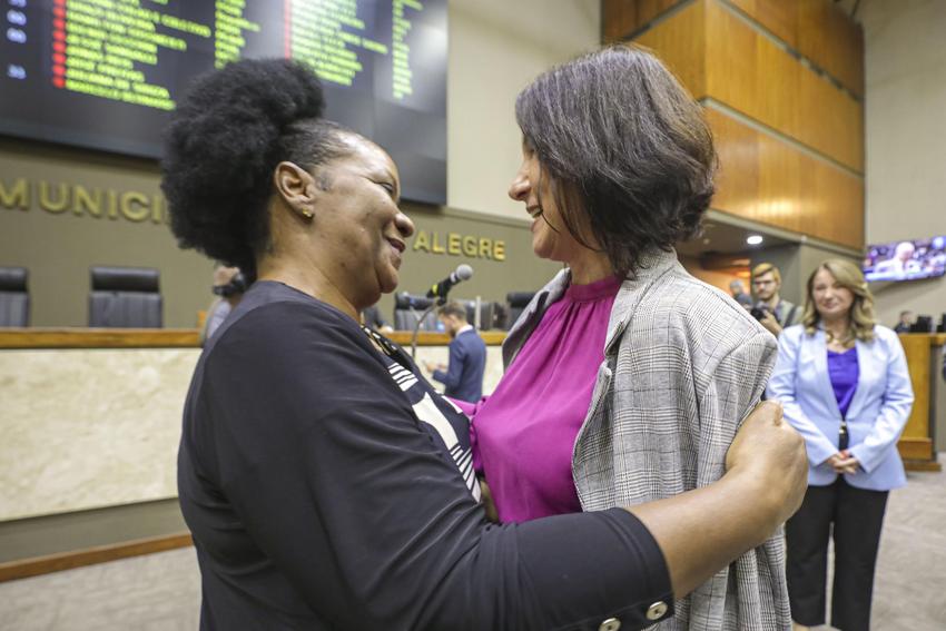 Porto Alegre, RS, Brasil, 10/11/2025: A prefeita em exercício, Comandante Nádia, participou, na tarde desta segunda-feira (10), da sessão plenária da Câmara Municipal de Vereadores (CMPA), em homenagem às primeiras militares femininas no então Batalhão de Choque (BPchq) da Brigada Militar, hoje 1º Batalhão de Operações Especiais (BOE). Foto: Alex Rocha/PMPA