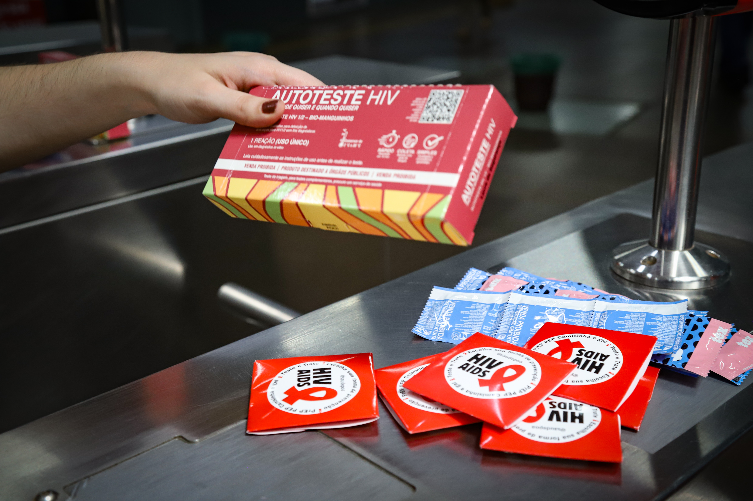 Porto Alegre, RS, 01/12/2025 O mês de dezembro é dedicado à conscientização, prevenção e enfrentamento ao HIV/Aids. A programação organizada pela SMS começou nesta segunda-feira, 1º, Dia Mundial de Combate ao HIV. Pela manhã, nas estações Mercado, Rodoviária e Farrapos da Trensurb, profissionais de saúde abordaram usuários com orientações, distribuição de autotestes, preservativos, gel lubrificante e folders. Foto: Cristine Rochol/PMPA