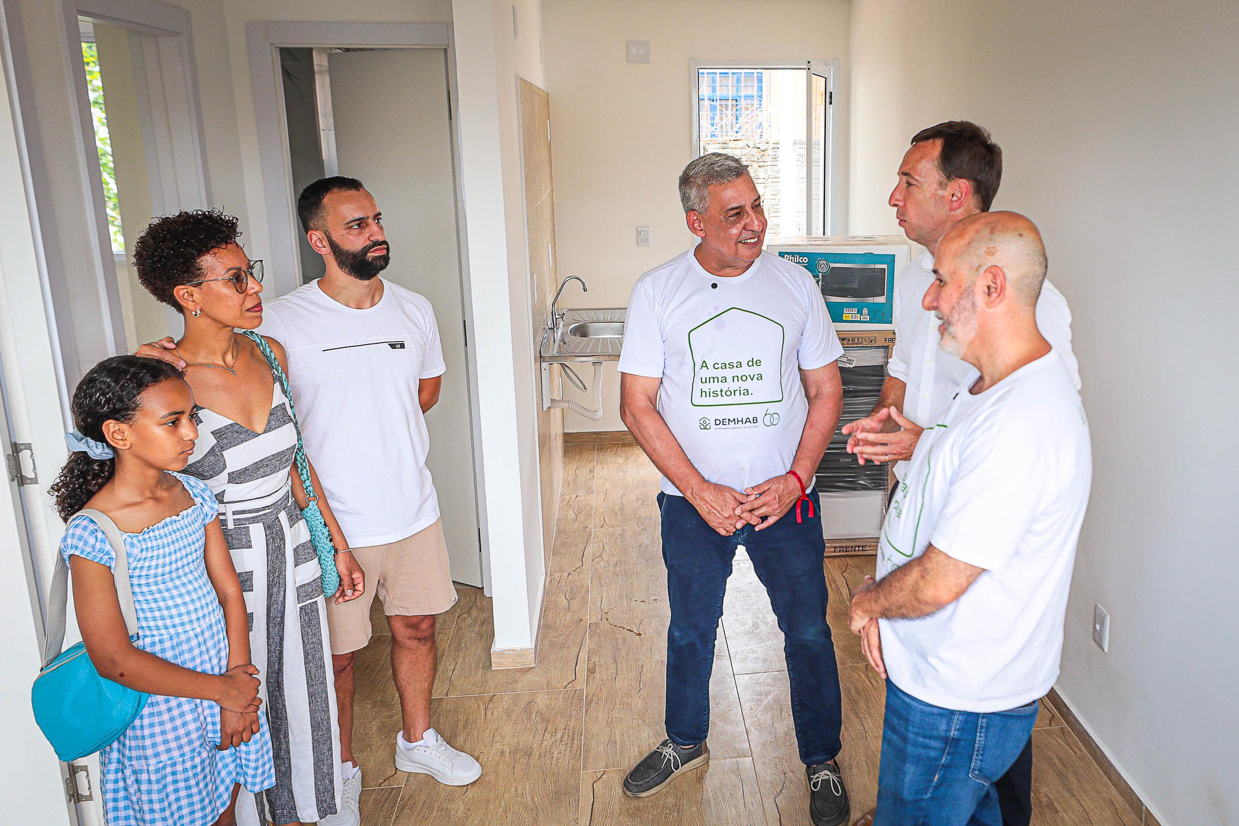 Porto Alegre, RS, Brasil, 08/12/2025: A Prefeitura de Porto Alegre e o Sindicato das Indústrias da Construção Civil do Estado do Rio Grande do Sul (Sinduscon-RS) realizaram nesta segunda-feira, 8, às 11h, a entrega de 31 unidades habitacionais na Rua Pedro Boticário, no bairro Glória. As moradias foram destinadas a famílias atingidas pelas enchentes e por outros eventos climáticos que impactaram a cidade. As casas foram doadas ao município pelo Sinduscon-RS, como parte de uma iniciativa voltada à reconstrução e ao apoio às populações mais vulneráveis diante dos recentes desastres naturais. Foto: Alex Rocha/PMPA