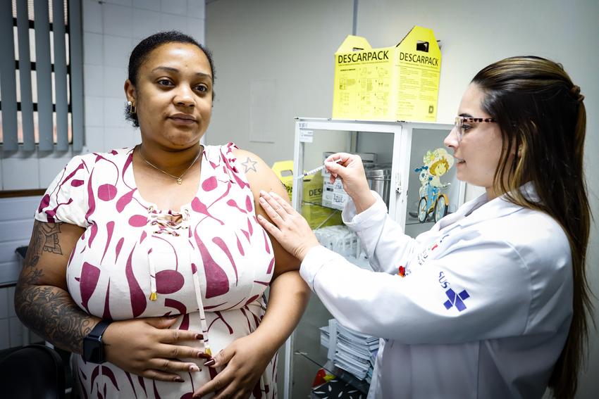 Porto Alegre, RS, 09/12/2025 Gestantes a partir da 28ª semana de gravidez já podem se vacinar contra a bronquiolite em todas unidades de saúde. O vírus sincicial respiratório (VSR) é um dos principais associados à doença e um dos maiores causadores de infecções respiratórias em recém-nascidos e crianças pequenas, sobretudo bebês. A vacina é indicada para grávidas de todas as idades, em dose única, a partir da 28ª semana, sem limite de idade gestacional. Na foto a vacina sendo aplicada na gestante, Juliana, que realiza o pré-natal na Unidade de Saúde Passo das Pedras II (av. 10 de Maio, 255). Foto: Cristine Rochol/PMPA