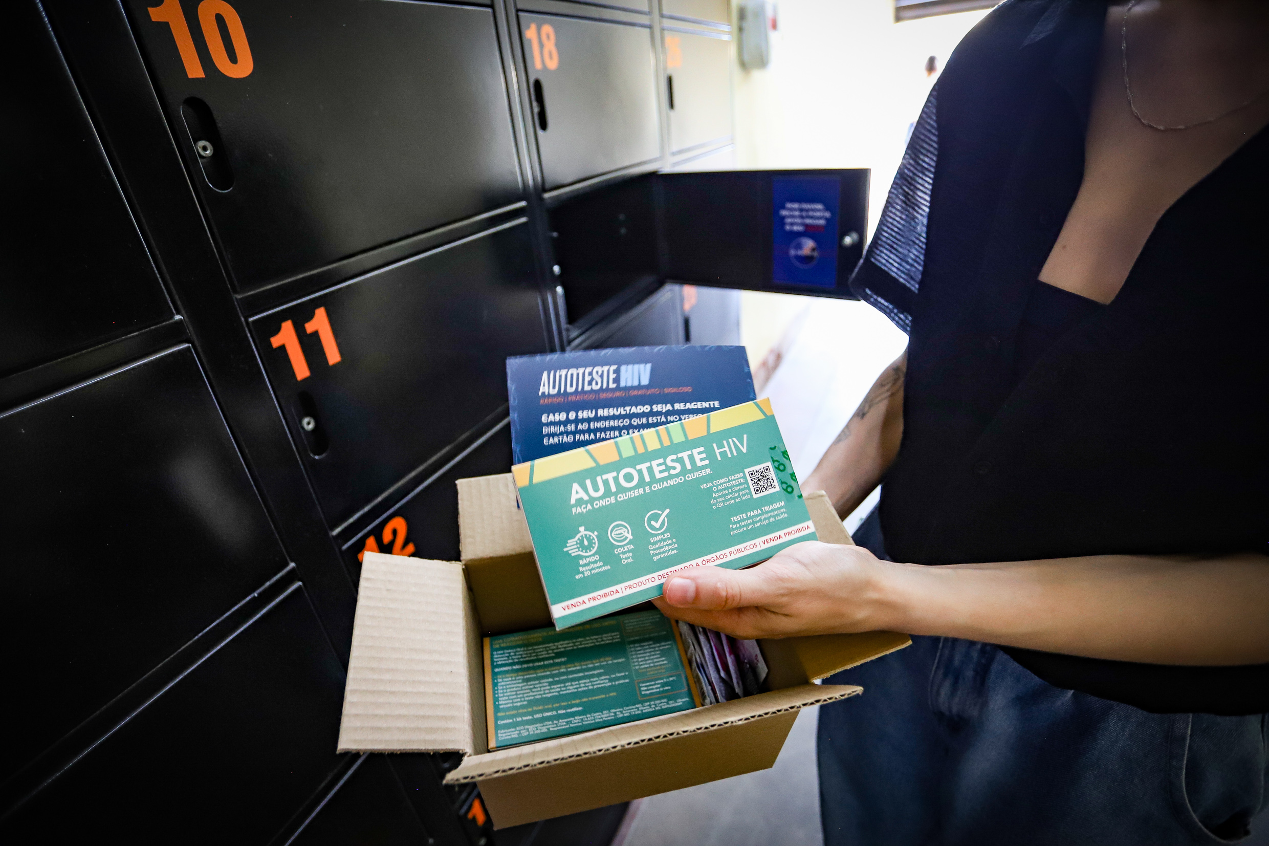 Porto Alegre, RS, 08/12/2025 Programa A Hora é Agora. Armário para retirada de kit com autoteste e orientações, localizado no interior do Mercado Público (entrada da Praça Parobé quase na esquina com Júlio de Castilhos). Foto: Cristine Rochol/PMPA