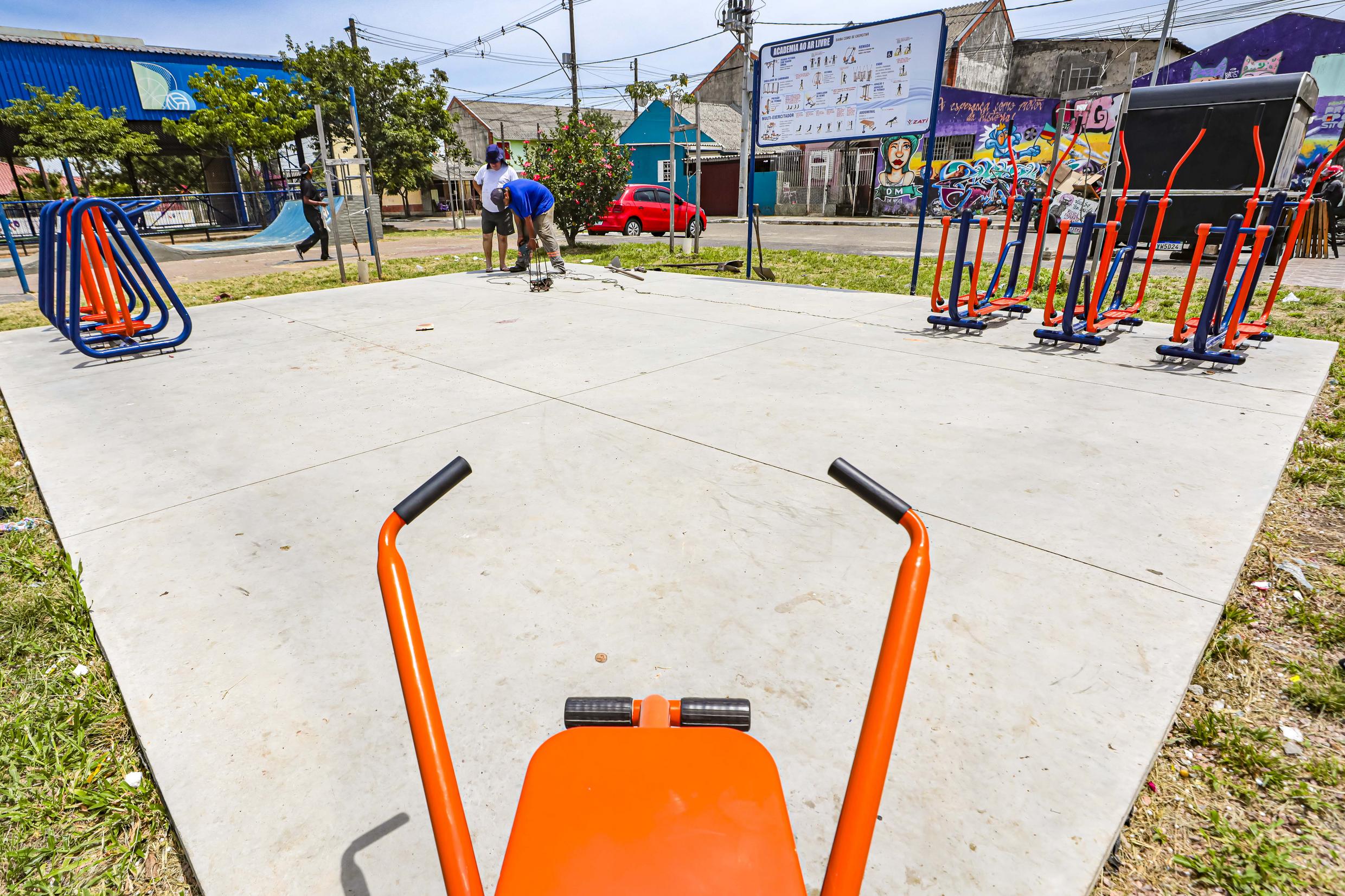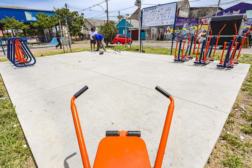 Porto Alegre, RS, Brasil, 15/12/2025: Nesta segunda-feira (15), a secretaria Municipal de Serviços Urbanos (SMSURB), conclui a instalação da nova academia ao ar livre, no Loteamento Santa Terezinha. Foto: Alex Rocha/PMPA