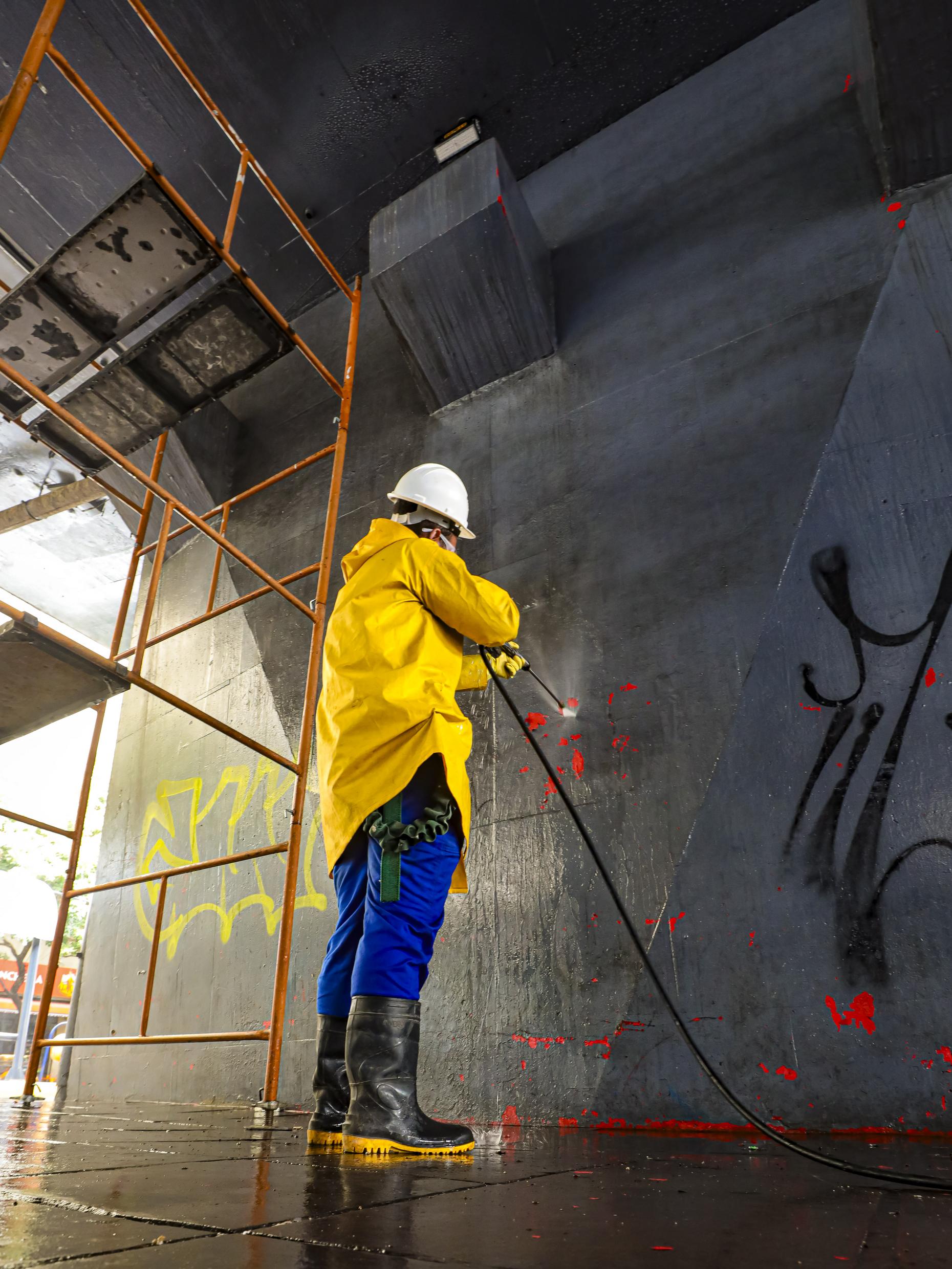 Porto Alegre, RS, Brasil, 08/01/2026: Equipes da secretaria municipal de Serviços Urbanos (SMSURB), realizam lavagem da parte de baixo do Viaduto da Conceição, na manhã desta quinta-feira (08). Foto: Alex Rocha/PMPA