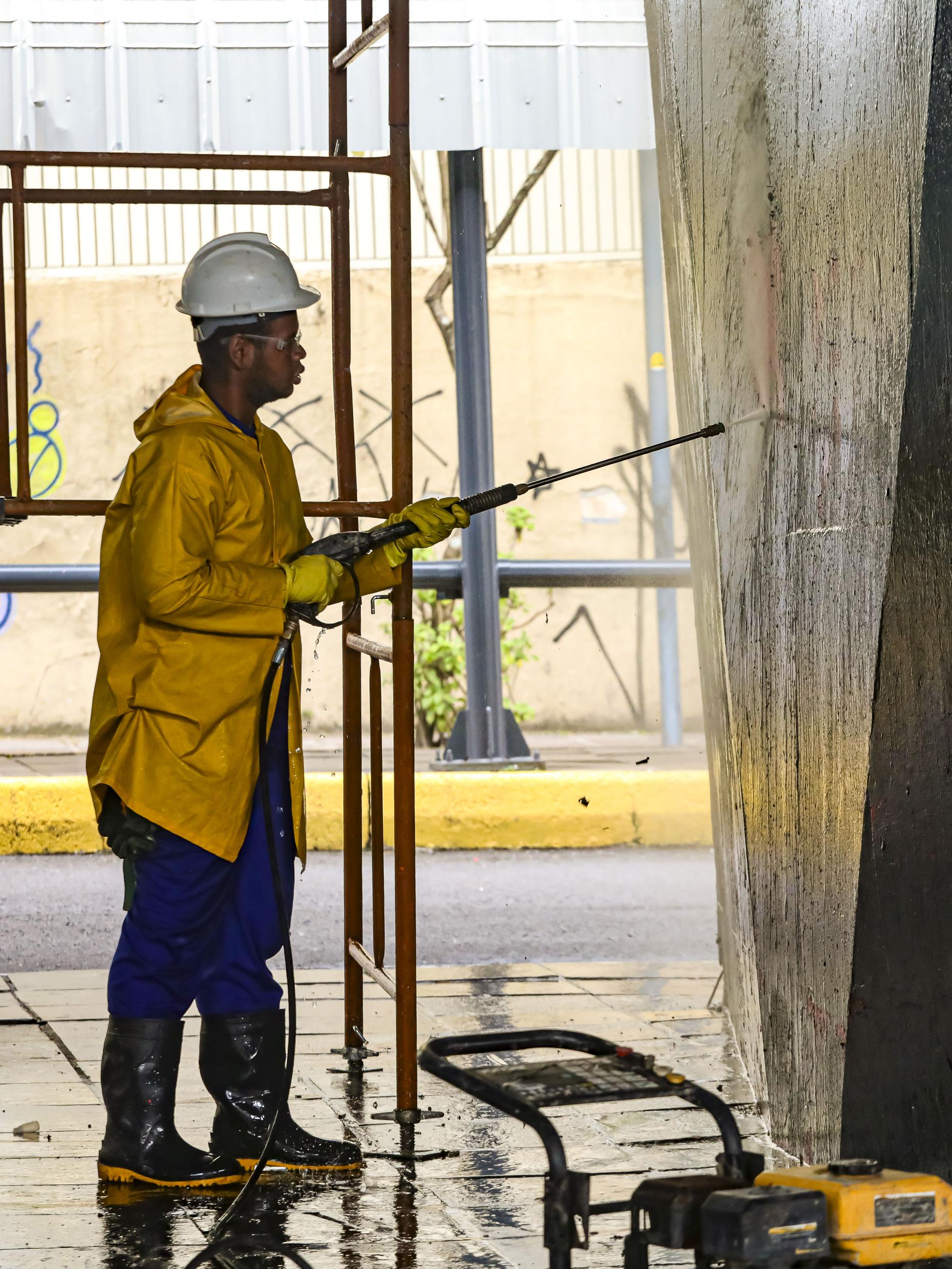 Porto Alegre, RS, Brasil, 08/01/2026: Equipes da secretaria municipal de Serviços Urbanos (SMSURB), realizam lavagem da parte de baixo do Viaduto da Conceição, na manhã desta quinta-feira (08). Foto: Alex Rocha/PMPA