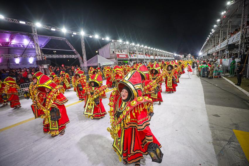 Porto Alegre, RS, Brasil, 01/03/2026: A S.B.R. Imperadores do Samba entra na avenida na madrugada deste domingo (01) com o enredo Orin Alá – Canto para Sonhar. A escola narrou a lenda da princesa africana Orin Alá, cuja trajetória é marcada pela ruptura da paz em sua terra natal, o sequestro por navios negreiros e a resistência através do seu canto sagrado em solo brasileiro. A narrativa exalta a voz como um instrumento de cura e liberdade, capaz de conduzir um sonho coletivo que reconecta o povo escravizado às suas raízes e identidade africana. Foto: Alex Rocha/PMPA