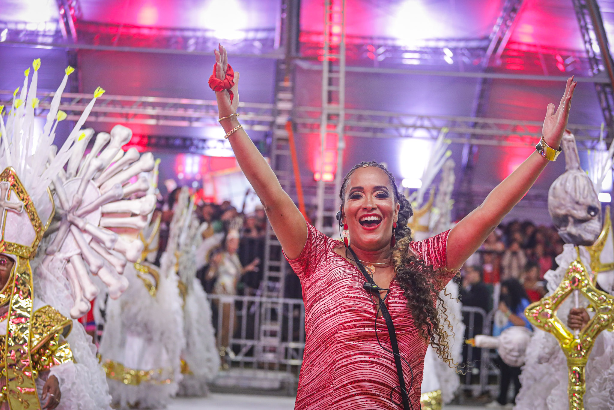 Porto Alegre, RS, Brasil, 01/03/2026: A S.B.R. Imperadores do Samba entra na avenida na madrugada deste domingo (01) com o enredo Orin Alá – Canto para Sonhar. A escola narrou a lenda da princesa africana Orin Alá, cuja trajetória é marcada pela ruptura da paz em sua terra natal, o sequestro por navios negreiros e a resistência através do seu canto sagrado em solo brasileiro. A narrativa exalta a voz como um instrumento de cura e liberdade, capaz de conduzir um sonho coletivo que reconecta o povo escravizado às suas raízes e identidade africana. Foto: Alex Rocha/PMPA