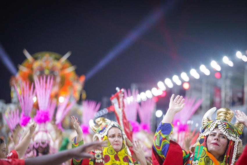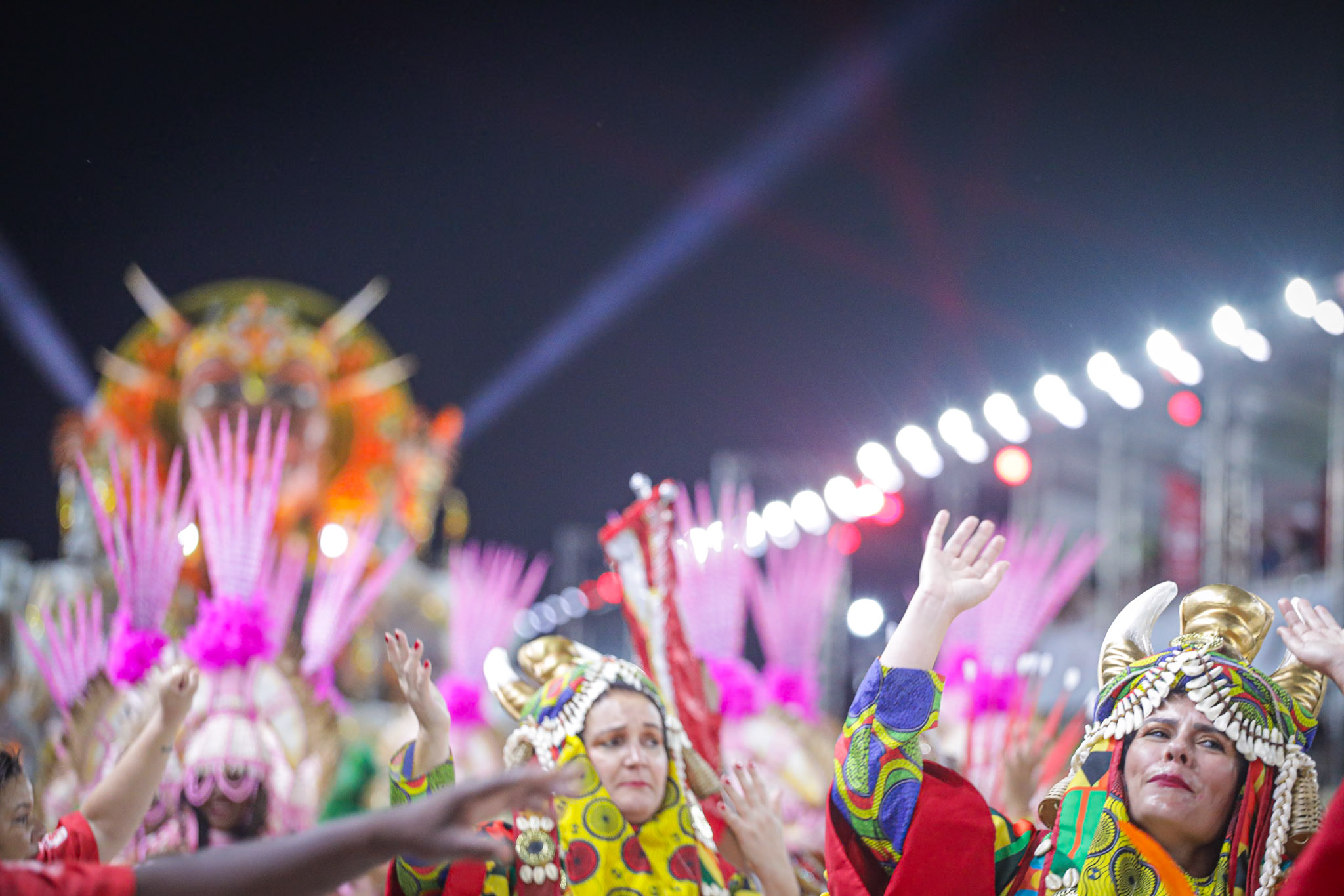 Porto Alegre, RS, Brasil, 01/03/2026: A S.B.R. Imperadores do Samba entra na avenida na madrugada deste domingo (01) com o enredo Orin Alá – Canto para Sonhar. A escola narrou a lenda da princesa africana Orin Alá, cuja trajetória é marcada pela ruptura da paz em sua terra natal, o sequestro por navios negreiros e a resistência através do seu canto sagrado em solo brasileiro. A narrativa exalta a voz como um instrumento de cura e liberdade, capaz de conduzir um sonho coletivo que reconecta o povo escravizado às suas raízes e identidade africana. Foto: Alex Rocha/PMPA
