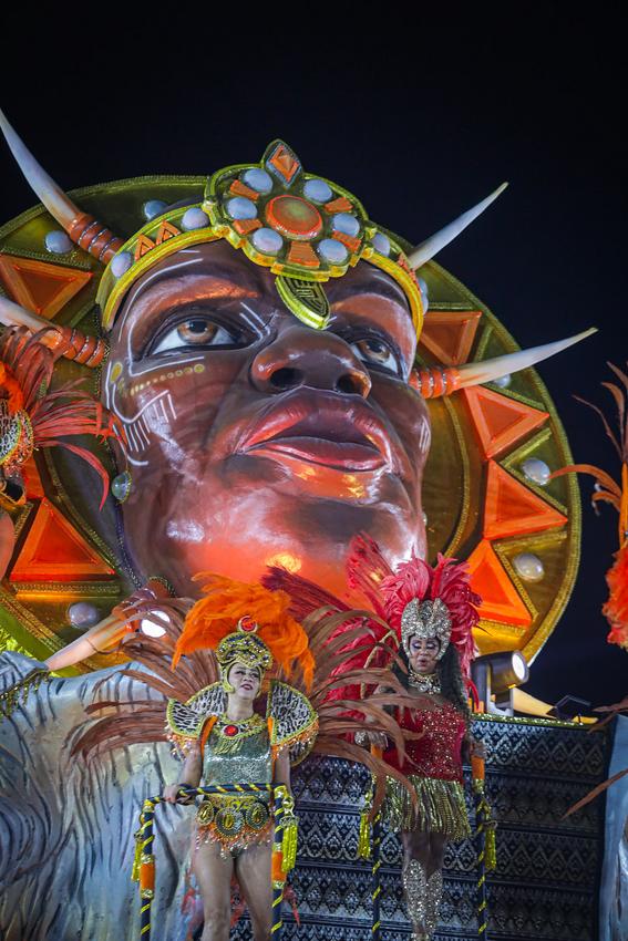 Porto Alegre, RS, Brasil, 01/03/2026: A S.B.R. Imperadores do Samba entra na avenida na madrugada deste domingo (01) com o enredo Orin Alá – Canto para Sonhar. A escola narrou a lenda da princesa africana Orin Alá, cuja trajetória é marcada pela ruptura da paz em sua terra natal, o sequestro por navios negreiros e a resistência através do seu canto sagrado em solo brasileiro. A narrativa exalta a voz como um instrumento de cura e liberdade, capaz de conduzir um sonho coletivo que reconecta o povo escravizado às suas raízes e identidade africana. Foto: Alex Rocha/PMPA