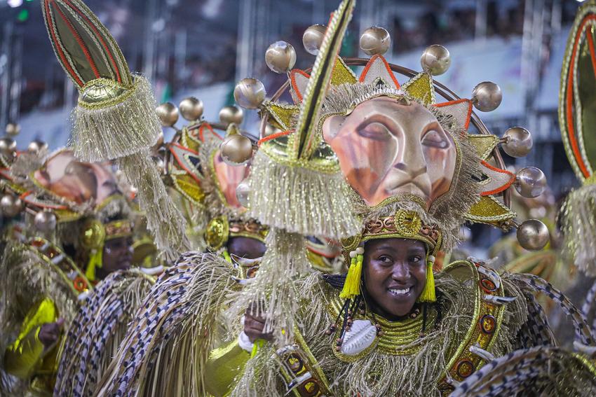Porto Alegre, RS, Brasil, 01/03/2026: A S.R.B. Estado Maior da Restinga participou do Carnaval de Porto Alegre na madrugada deste domingo (01). A escola apresentou o enredo Restinga, o canto de todos os povos, que reconta a trajetória do bairro, desde a sua ocupação por famílias removidas de diversas áreas de Porto Alegre até a transformação em um polo de cultura e resistência. A narrativa exaltou a superação de um povo que, diante do esquecimento social, construiu com as próprias mãos uma cidade vibrante. Foto: Alex Rocha/PMPA