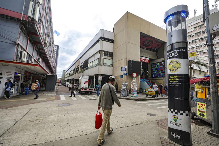 Porto Alegre, RS, Brasil, 07/4/2026: A capital tem treze totens de segurança instalados em regiões de grande fluxo de pessoas. Cada equipamento tem quatro metros de altura e é equipado com três câmeras de videomonitoramento, com cobertura de 360º em imagens. O objetivo é facilitar o acesso da população aos serviços de segurança e saúde, em casos de emergências. Por meio de um botão, é acionada a central de atendimento. Foto: Alex Rocha/PMPA