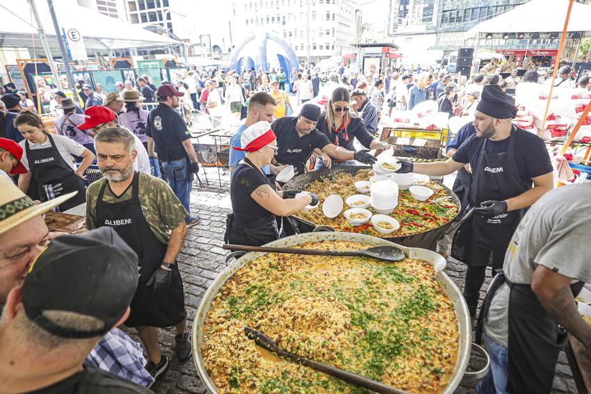 Porto Alegre, RS, Brasil, 15/4/2026: Nesta quarta-feira, 15, a partir das 12h, ocorreu o tradicional Assado e Paella Solidária no Largo Glênio Peres. Foram distribuídos 1.250 quilos de carne e 900 quilos de paella gaúcha, acompanhados de pão, refrigerante e água. O chef de cozinha e coordenador dos assadores foi René Barbachan, tradicionalista, cozinheiro, assador e patrono do Acampamento Farroupilha de Porto Alegre em 2025, juntamente com José Roberto Maraschin. A atividade foi gratuita, contou com diversas atrações musicais, como a Banda da Brigada Militar, Fábrica de Gaiteiros, de Borguetinho, com apresentação de músicas gauchescas, além de pagode e samba. Elmer Fagundes e Marcelo Cachoeira também se apresentam em parceria com a Secretaria Municipal da Cultura. Foto: Alex Rocha/PMPA