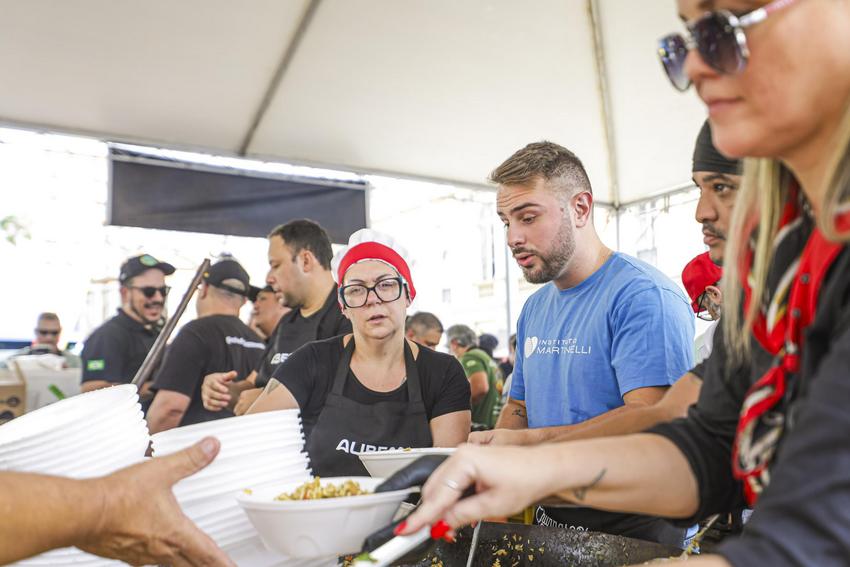 Porto Alegre, RS, Brasil, 15/4/2026: Nesta quarta-feira, 15, a partir das 12h, ocorreu o tradicional Assado e Paella Solidária no Largo Glênio Peres. Foram distribuídos 1.250 quilos de carne e 900 quilos de paella gaúcha, acompanhados de pão, refrigerante e água. O chef de cozinha e coordenador dos assadores foi René Barbachan, tradicionalista, cozinheiro, assador e patrono do Acampamento Farroupilha de Porto Alegre em 2025, juntamente com José Roberto Maraschin. A atividade foi gratuita, contou com diversas atrações musicais, como a Banda da Brigada Militar, Fábrica de Gaiteiros, de Borguetinho, com apresentação de músicas gauchescas, além de pagode e samba. Elmer Fagundes e Marcelo Cachoeira também se apresentam em parceria com a Secretaria Municipal da Cultura. Foto: Alex Rocha/PMPA