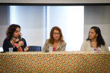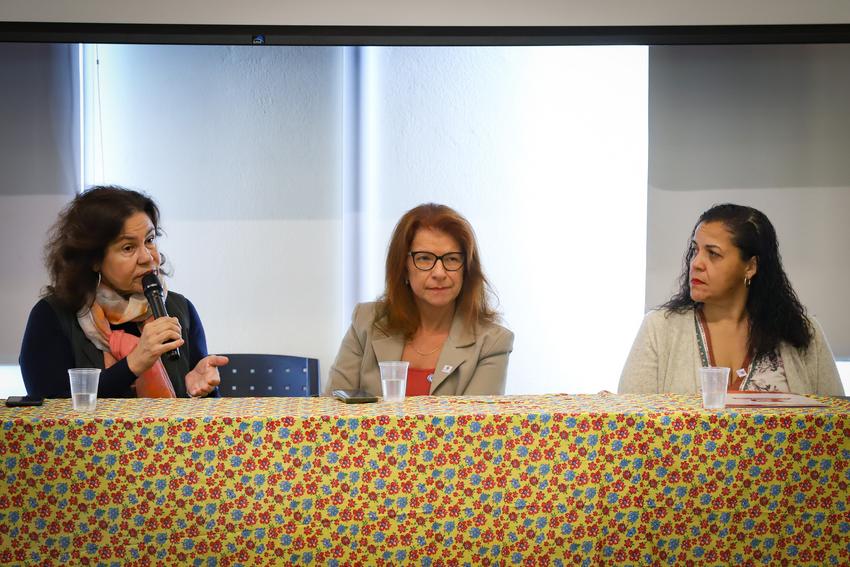 Mesa de abertura com a diretora da DAPS, Vânia Frantz, a Coord. de Gestão de Pessoas da SMS, Lívia Almeida e a Pró-Reitora de Graduação da UFRGS, Nadya Pesce da Silveira. Foto: Cristine Rochol/PMPA