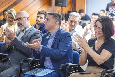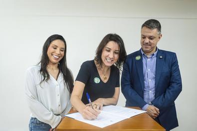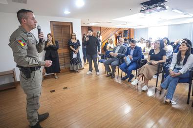 Porto Alegre, RS, Brasil, 14/11/2025: A prefeita em exercício, Comandante Nádia, participou, na manhã desta sexta-feira (14), no auditório do 18º andar do Centro Administrativo Municipal Guilherme Socias Villela (CAM) , do ato de sanção de lei do vereador Coronel Ustra. Foto: Alex Rocha/PMPA