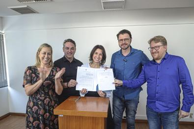 Porto Alegre, RS, Brasil, 13/11/2025: A prefeita em exercício, Comandante Nádia, participou, na tarde desta quinta-feira (13), no auditório do 18º andar do Centro Administrativo Municipal Guilherme Socias Villela (CAM), do ato de sanção de Leis dos Vereadores Jessé Sangalli e Rafael Fleck. Foto: Alex Rocha/PMPA