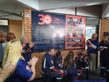 Porto Alegre, RS, 14/11/2025. O Serviço de Atendimento Móvel de Urgência (Samu) de Porto Alegre completa 30 anos de atuação nesta sexta-feira, 14 de novembro. Para marcar a data a Secretarial Municipal de Saúde realizou o descerramento de placa comemorativa e do painel histórico das três décadas do serviço na Capital.