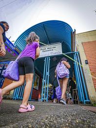 Porto Alegre, RS, Brasil, 18/02/2026: As aulas da rede municipal de ensino retornam nesta quarta-feira, 18, e as escolas já organizam uma recepção especial para acolher os estudantes após quase 60 dias de recesso. A proposta é marcar o início do ano letivo com atividades que reforcem o vínculo, o entusiasmo e o sentimento de pertencimento. Na Escola Municipal de Ensino Fundamental (Emef) Prof. Anísio Teixeira, por exemplo, os alunos foram recebidos com um espaço instagramável para fotos e distribuição de sacolés. Foto: Cesar Lopes/PMPA