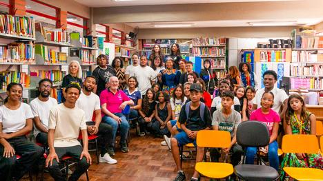 Porto Alegre, RS, Brasil - 12/11/2025: A Escola Municipal de Ensino Fundamental Heitor Villa-Lobos recebeu a visita da rainha Diambi Kabatusuila, do povo Bena Tshiyamba, da República Democrática do Congo. Durante a visita, a rainha conheceu os espaços do EEABI, os projetos desenvolvidos pelos estudantes e acompanhou uma apresentação de capoeira. Local: EMEF Heitor Villa Lobos: Av. Santo Dias da Silva, 460 - Lomba do Pinheiro. Foto: Henry Rodrigues/SMED/PMPA