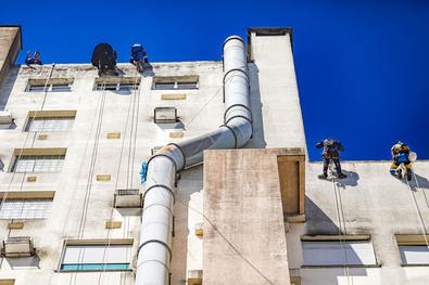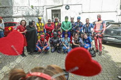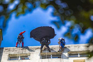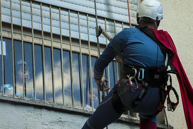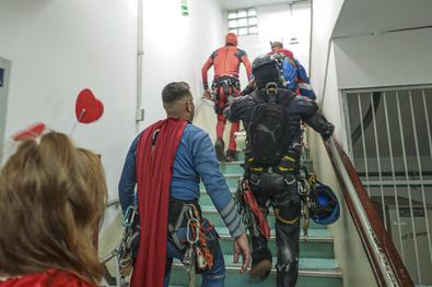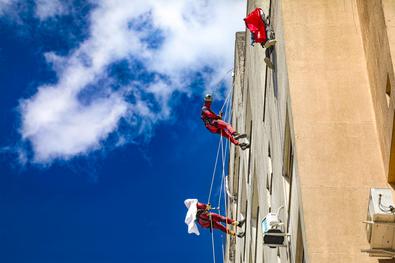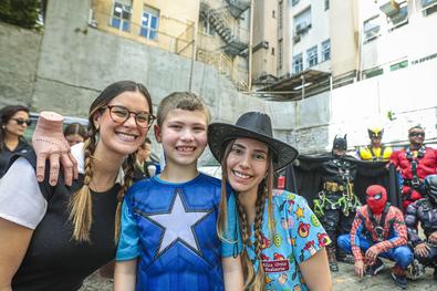 Porto Alegre, RS, Brasil, 10/10/2025: Crianças atendidas no Hospital Materno-Infantil Presidente Vargas (HMIPV) receberam uma visita especial nesta sexta-feira, 10. Do alto do 14º andar, alpinistas vestidos de super-heróis escalaram as paredes do prédio. A descida foi acompanhada por olhares atentos de funcionários e dos pequenos pacientes. A ação, alusiva ao Dia das Crianças, foi organizada pela psicopedagoga do Hospital, Juliana Pierdona, e contou com o apoio dos alpinistas voluntários da empresa M A Alpinismo Industrial, de Bento Gonçalves. A ação foi finalizada com a distribuição de brinquedos às crianças atendidas na pediatria e nas UTIs neonatal e pediátrica. Foto: Alex Rocha/PMPA