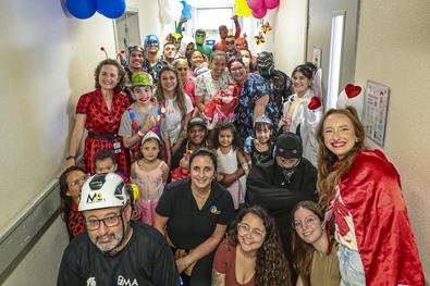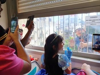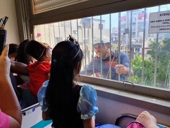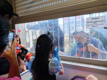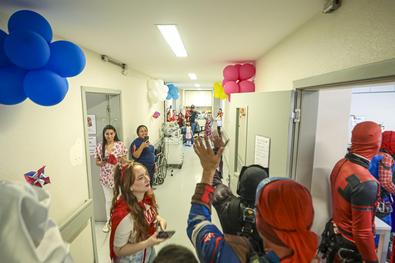 Porto Alegre, RS, Brasil, 10/10/2025: Crianças atendidas no Hospital Materno-Infantil Presidente Vargas (HMIPV) receberam uma visita especial nesta sexta-feira, 10. Do alto do 14º andar, alpinistas vestidos de super-heróis escalaram as paredes do prédio. A descida foi acompanhada por olhares atentos de funcionários e dos pequenos pacientes. A ação, alusiva ao Dia das Crianças, foi organizada pela psicopedagoga do Hospital, Juliana Pierdona, e contou com o apoio dos alpinistas voluntários da empresa M A Alpinismo Industrial, de Bento Gonçalves. A ação foi finalizada com a distribuição de brinquedos às crianças atendidas na pediatria e nas UTIs neonatal e pediátrica. Foto: Vanessa Conte/SMS