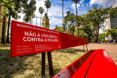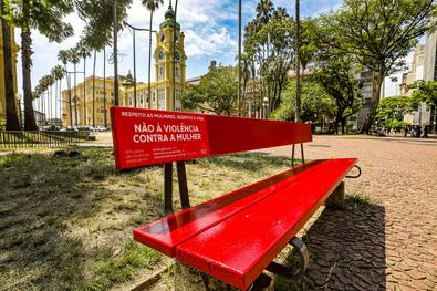 Porto Alegre, RS, Brasil, 06/03/2026: A Prefeitura de Porto Alegre entregou nesta sexta-feira, 6, o primeiro banco vermelho instalado pelo município em praças e parques da cidade, na Praça da Alfândega. A iniciativa integra um projeto de conscientização e enfrentamento à violência contra a mulher. Foto: Alex Rocha/PMPA