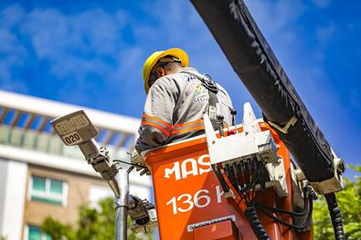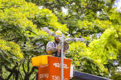 Porto Alegre, RS, Brasil, 13/01/2026: Funcionários da concessionária IPSul, a serviço da Secretaria Municipal de Serviços Urbanos (SMSURB), durante a instalação, na manhã desta terça-feira (13), dos novos postes de iluminação no Parque Moinhos de Vento (Parcão). Foto: Alex Rocha/PMPA