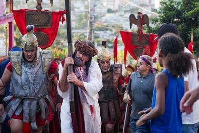 Porto Alegre, RS, 03/04/2026 - Nesta Sexta-Feira Santa, 3 de abril, ocorreu a 67ª encenação da Paixão de Cristo do Morro da Cruz, Zona Leste da Capital. A apresentação começou às 15h30, em frente ao Santuário São José do Murialdo (rua Vidal de Negreiros, 550 - São José), e reuniu artistas profissionais e moradores da comunidade em uma das mais tradicionais manifestações religiosas e culturais da cidade. Fotos: Pedro Piegas / PMPA