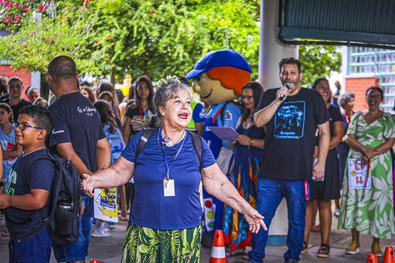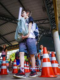 Porto Alegre, RS, Brasil, 18/02/2026: As aulas da rede municipal de ensino retornam nesta quarta-feira, 18, e as escolas já organizam uma recepção especial para acolher os estudantes após quase 60 dias de recesso. A proposta é marcar o início do ano letivo com atividades que reforcem o vínculo, o entusiasmo e o sentimento de pertencimento. Na Escola Municipal de Ensino Fundamental (Emef) Prof. Anísio Teixeira, por exemplo, os alunos foram recebidos com um espaço instagramável para fotos e distribuição de sacolés. Foto: Cesar Lopes/PMPA