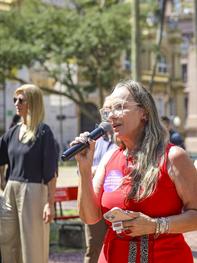 Porto Alegre, RS, Brasil, 06/03/2026: A Prefeitura de Porto Alegre entregou nesta sexta-feira, 6, o primeiro banco vermelho instalado pelo município em praças e parques da cidade, na Praça da Alfândega. A iniciativa integra um projeto de conscientização e enfrentamento à violência contra a mulher. Foto: Alex Rocha/PMPA