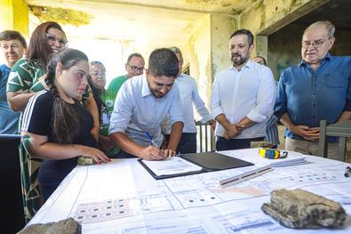 Porto Alegre, RS, Brasil, 05/01/2026: Acompanhado do secretário municipal de Educação, Leonardo Pascoal, o prefeito, Sebastião Melo, participou, do ato de assinatura da ordem de início das obras da Escola Municipal de Educação Infantil Raul Cauduro, no Bairro Mário Quintana. Foto: Alex Rocha/PMPA