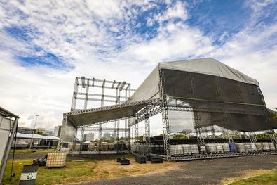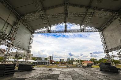 Porto Alegre, RS, Brasil, 22/12/2025: Montagem das estruturas para o Réveillon 2026. A chegada do Ano-Novo em Porto Alegre será realizada novamente no Parque Harmonia, com entrada gratuita. A programação se inicia às 17h do dia 31 e segue até as 3h de 1º de janeiro. Conforme a concessionária GAM3 Parks, a expectativa é reunir 175 mil pessoas, que poderão celebrar a virada do ano com shows de atrações nacionais e da cultura local. Foto: Alex Rocha/PMPA