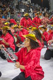 Porto Alegre, RS, Brasil, 27/02/2026: O Complexo Cultural do Porto Seco recebeum nesta sexta-feira, 27, a G.R.E.S.B.C.E.S. Filhos de Maria. A escola levou para a avenida o enredo Xilogravura, uma imersão poética na técnica de imprimir histórias através da madeira. A escola transformou o desfile em uma galeria viva, celebrando a estética do Ukiyo-e e a conexão entre a arte oriental e a expressão popular. A narrativa exalta a disciplina e a espiritualidade de culturas milenares, mostrando como o corte preciso na madeira revela a alma de um povo. Foto: Alex Rocha/PMPA